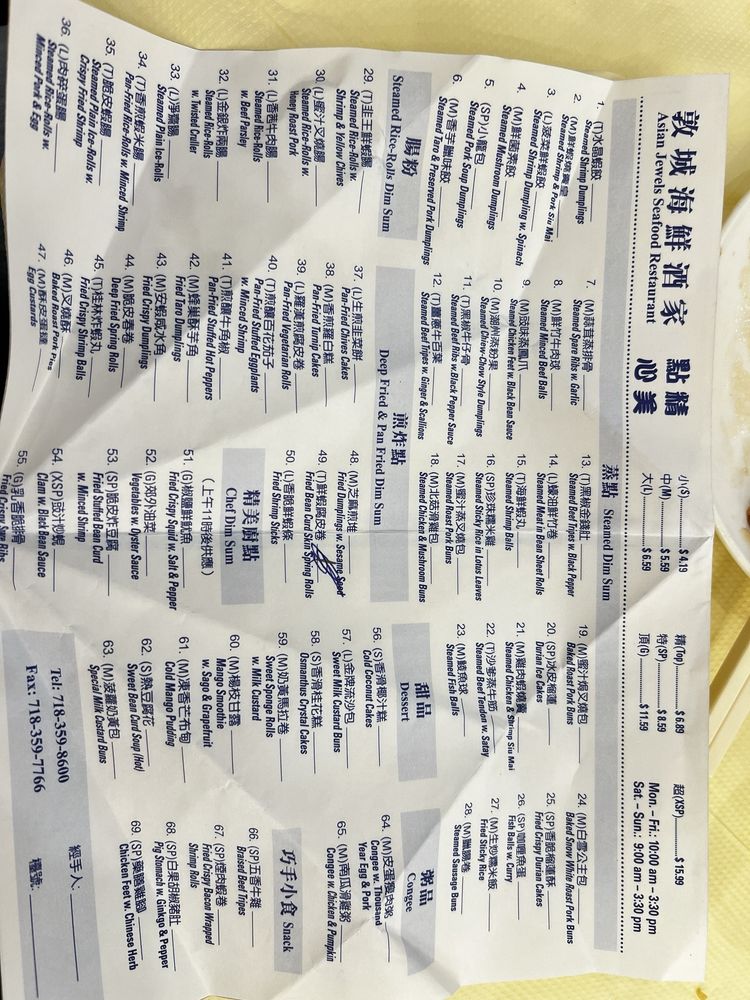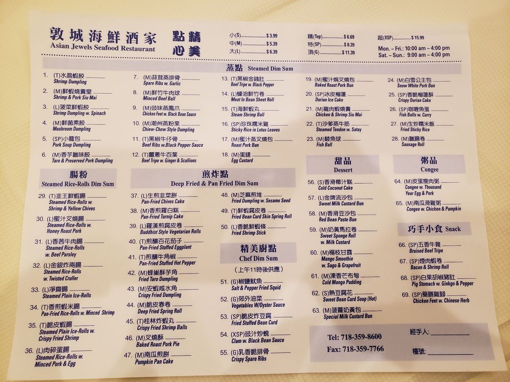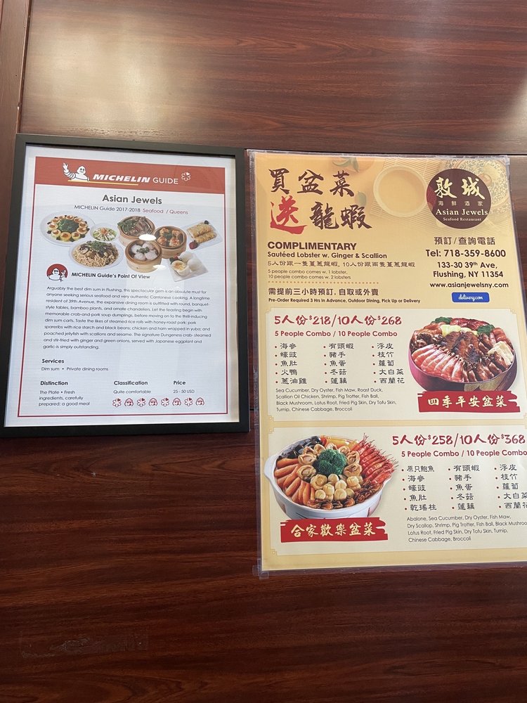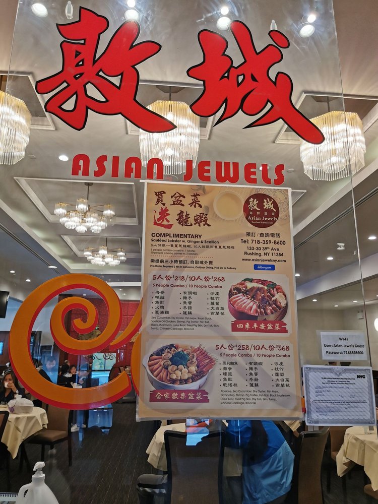 Asian Jewels Seafood Restaurant in Flushing, NY, stands out for its bustling atmosphere and traditional dim sum offerings. This Asian-owned establishment offers a wide variety of dim sum dishes served on carts, providing a classic dining experience. Customers praise the flavorful seafood pan-fried noodles, king crab, stuffed chicken legs, and a range of dim sum favorites like Hargow and dumplings. The restaurant is spacious, making it ideal for larger groups, and offers amenities like outdoor seating, catering, and free Wi-Fi. Despite being busy during peak hours, Asian Jewels' efficient service and valet parking make dining here convenient. With positive reviews highlighting the friendly staff and authentic cuisine, Asian Jewels Seafood Restaurant is a must-visit for dim sum enthusiasts seeking a nostalgic dining experience.
